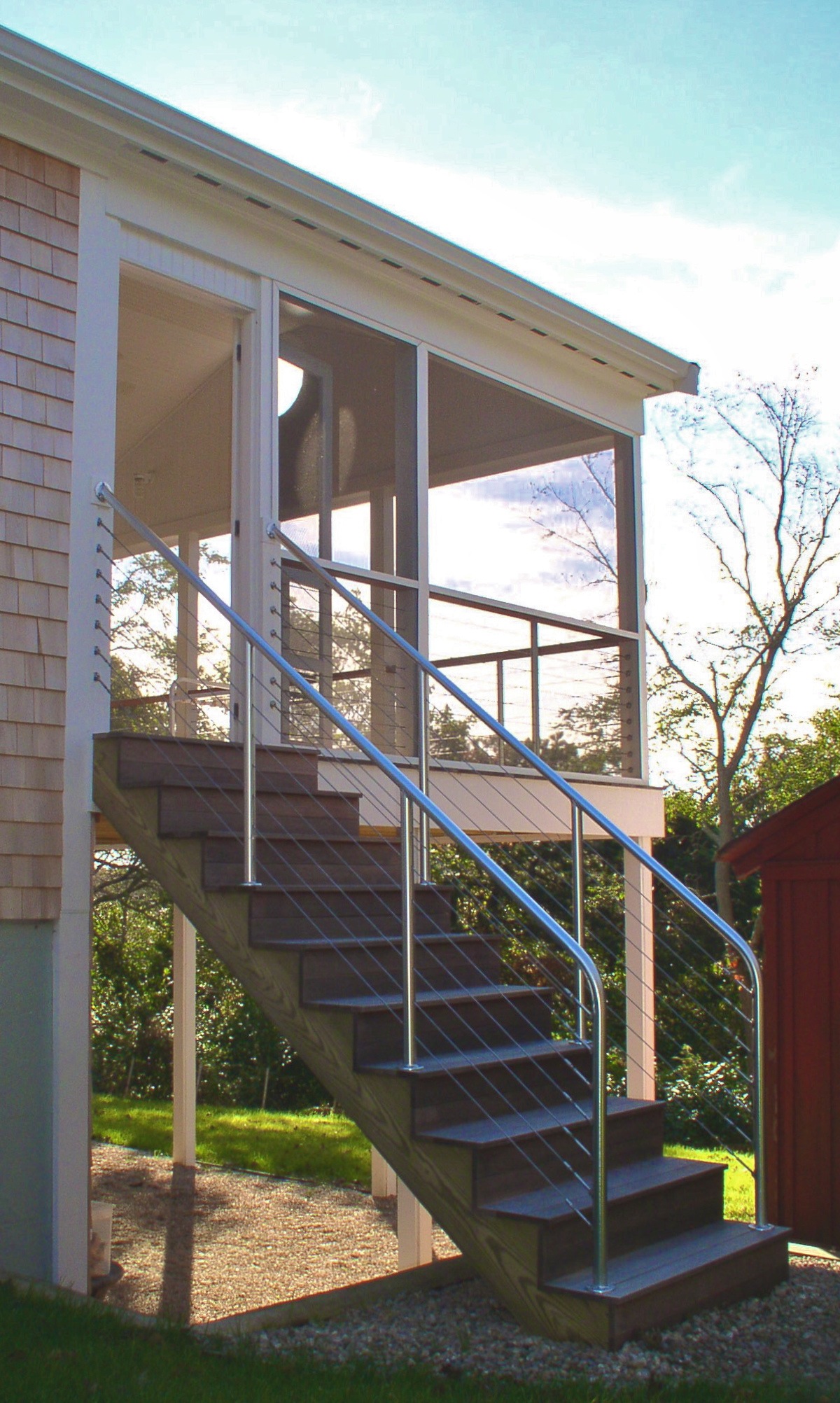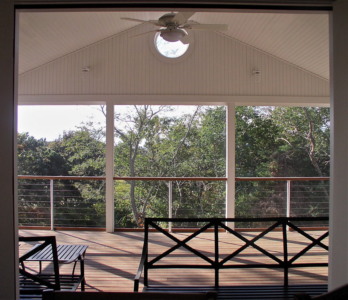 An entry porch with pipe and cable railings and mahogany decking welcomes visitors to climb aboard the house.   A large screened porch overlooking the marsh behind the house serves as a summer living room.