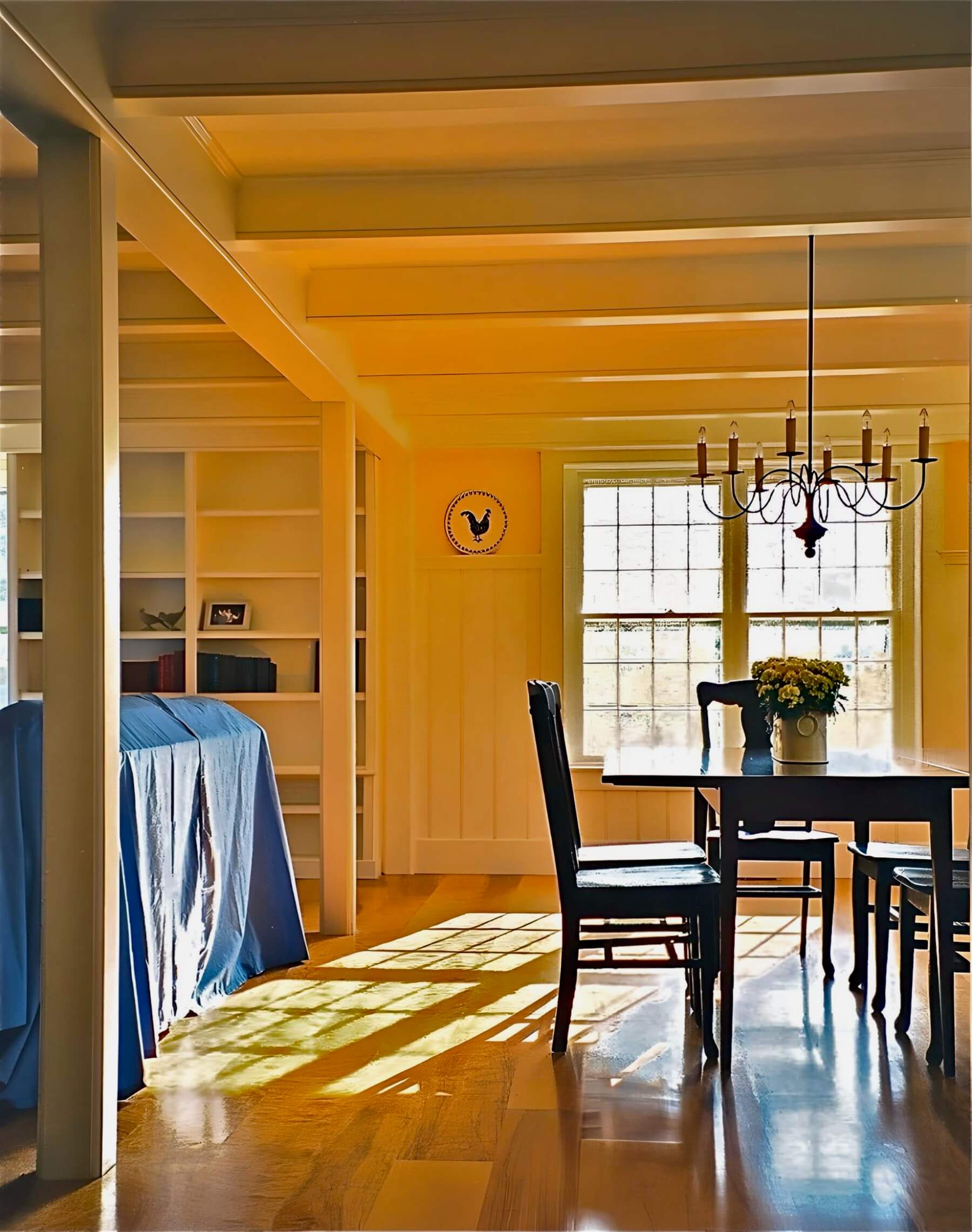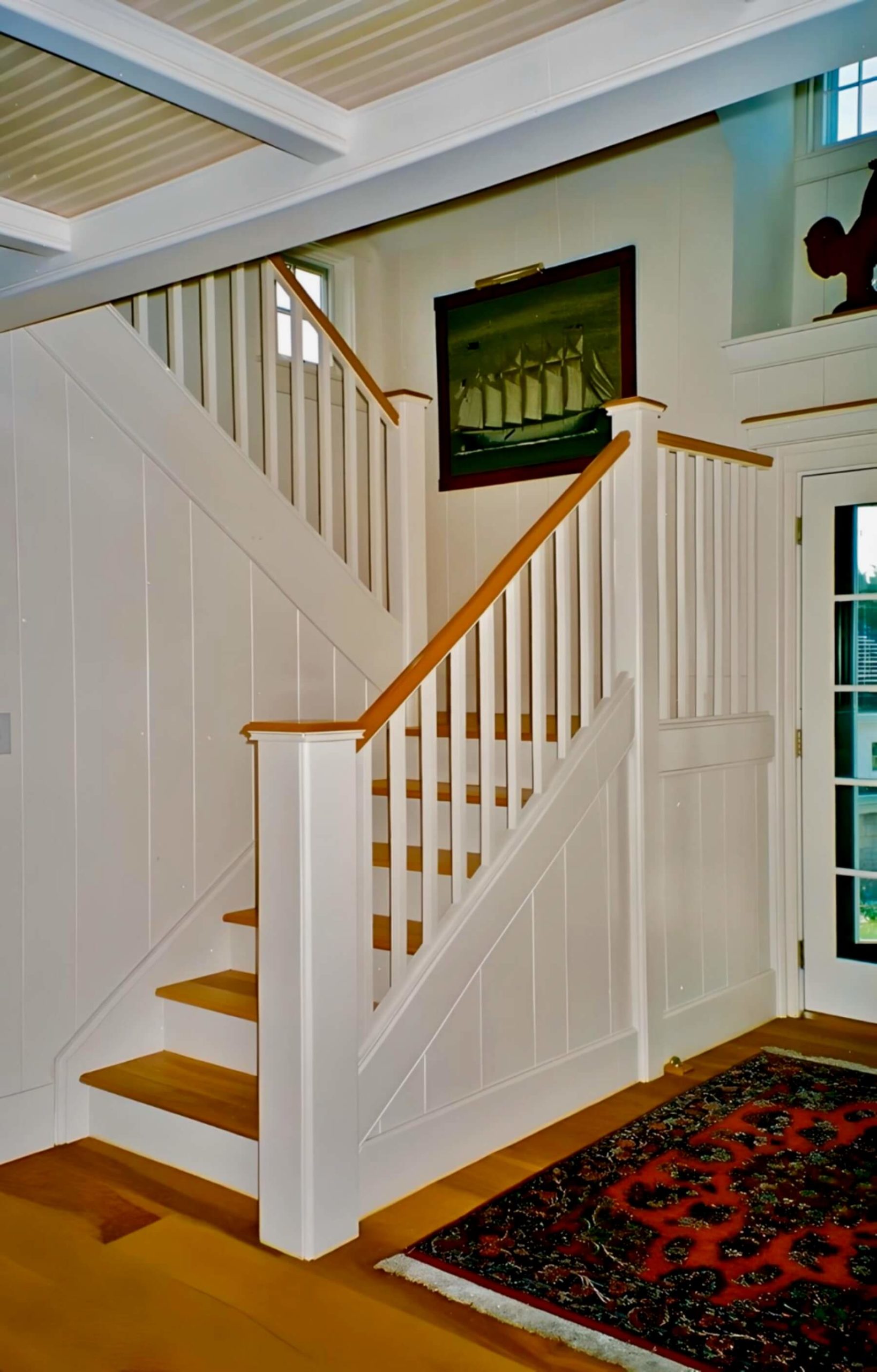 The main entry is from the small farmer’s porch into a surprisingly spacious vaulted stair hall lit by a doghouse dormer and three small windows running up along the stair. The living room, dining room and kitchen are all open to each other, but defined by columns, ceiling beams and the substantial kitchen island. Large windows and glass doors at the back of the house provide views of the water.
