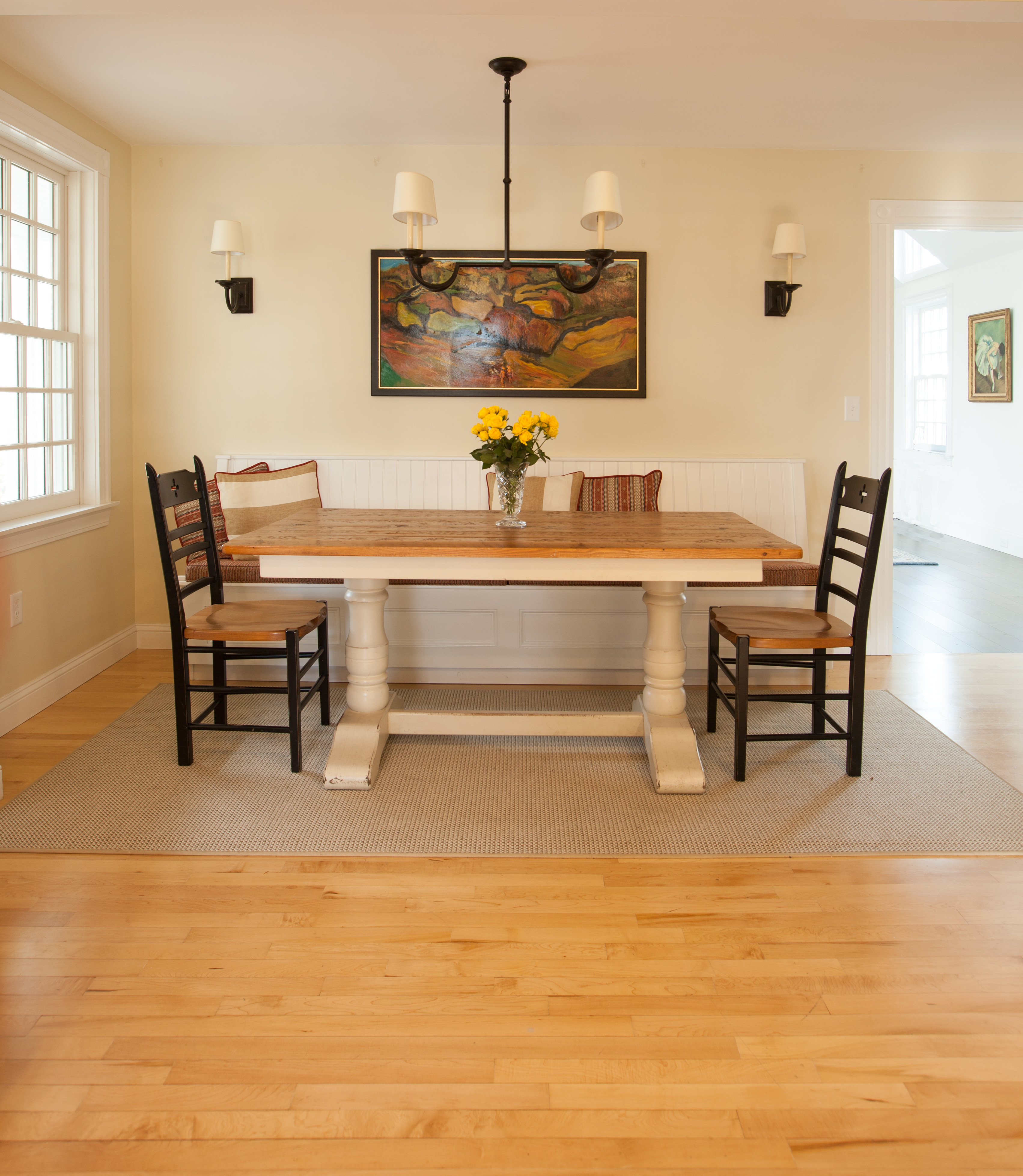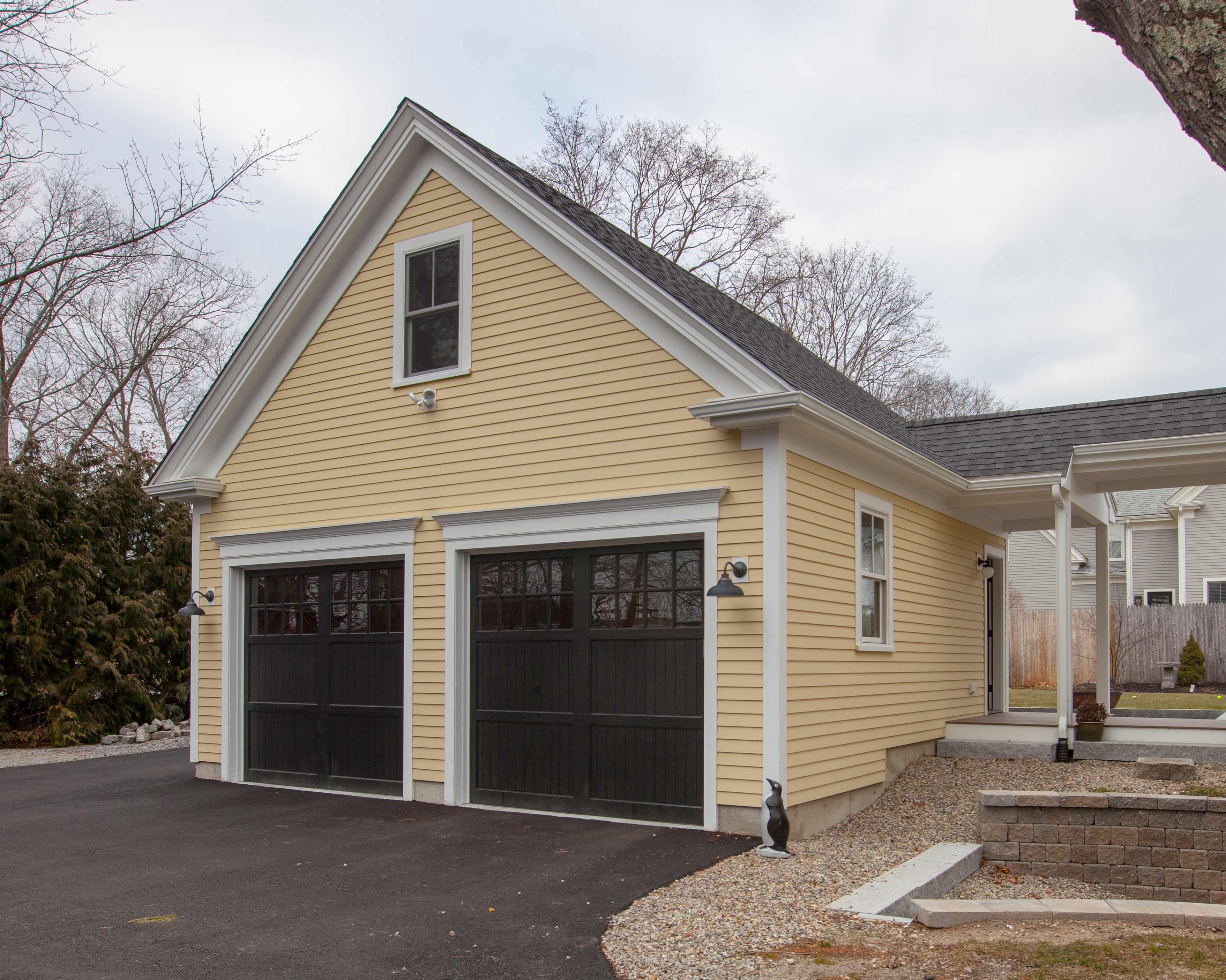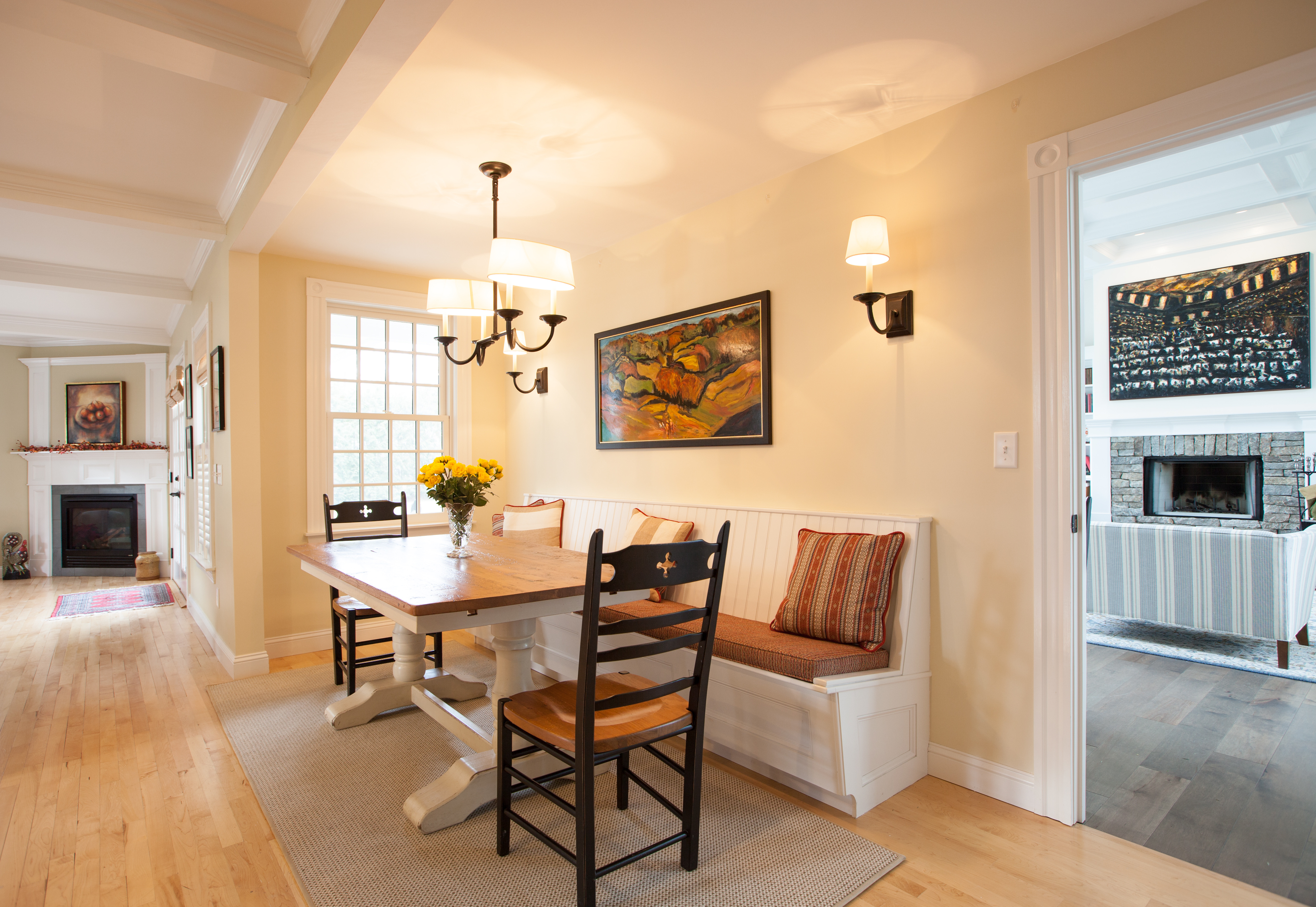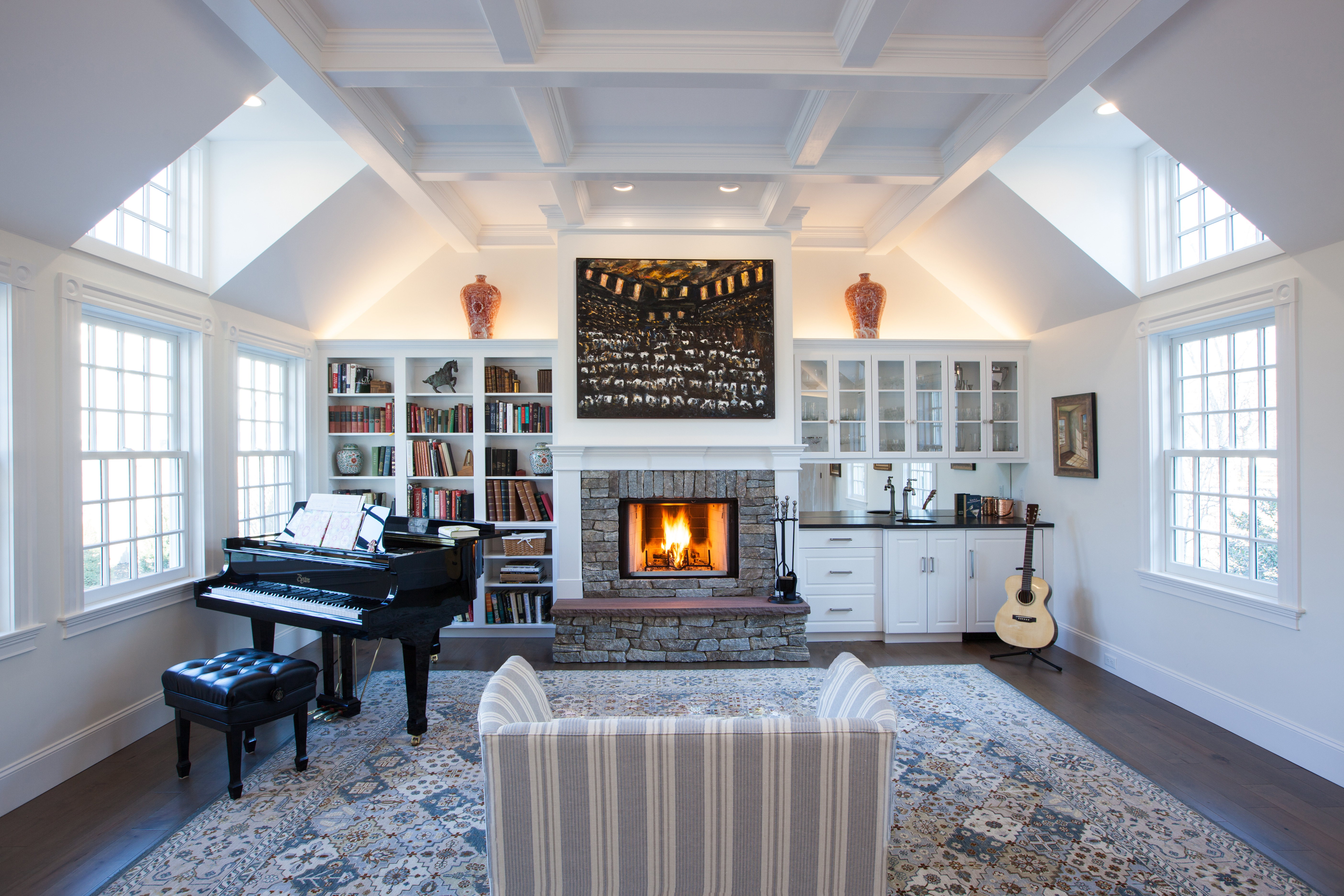 For Phase 2 on Union Street we added a Music Room, renovated the existing Kitchen, added a new breakfast nook, and built a new garage.  A covered porch with an oversized deck and breezeway connect the new additions.  The coffered ceiling of the Music Room contains acoustical panels to absorb sound reflected by the ample glass overlooking the porch, deck and yard.