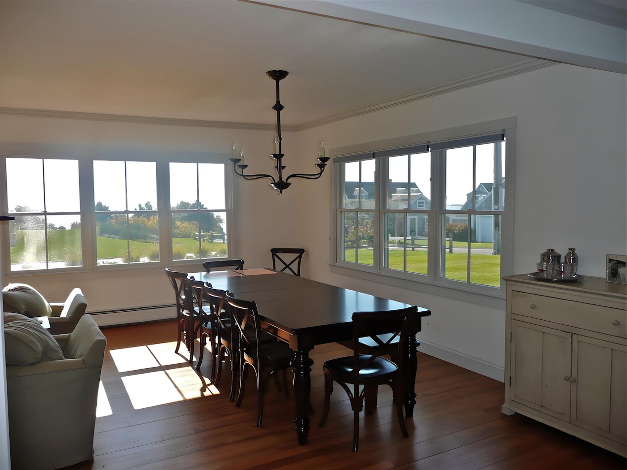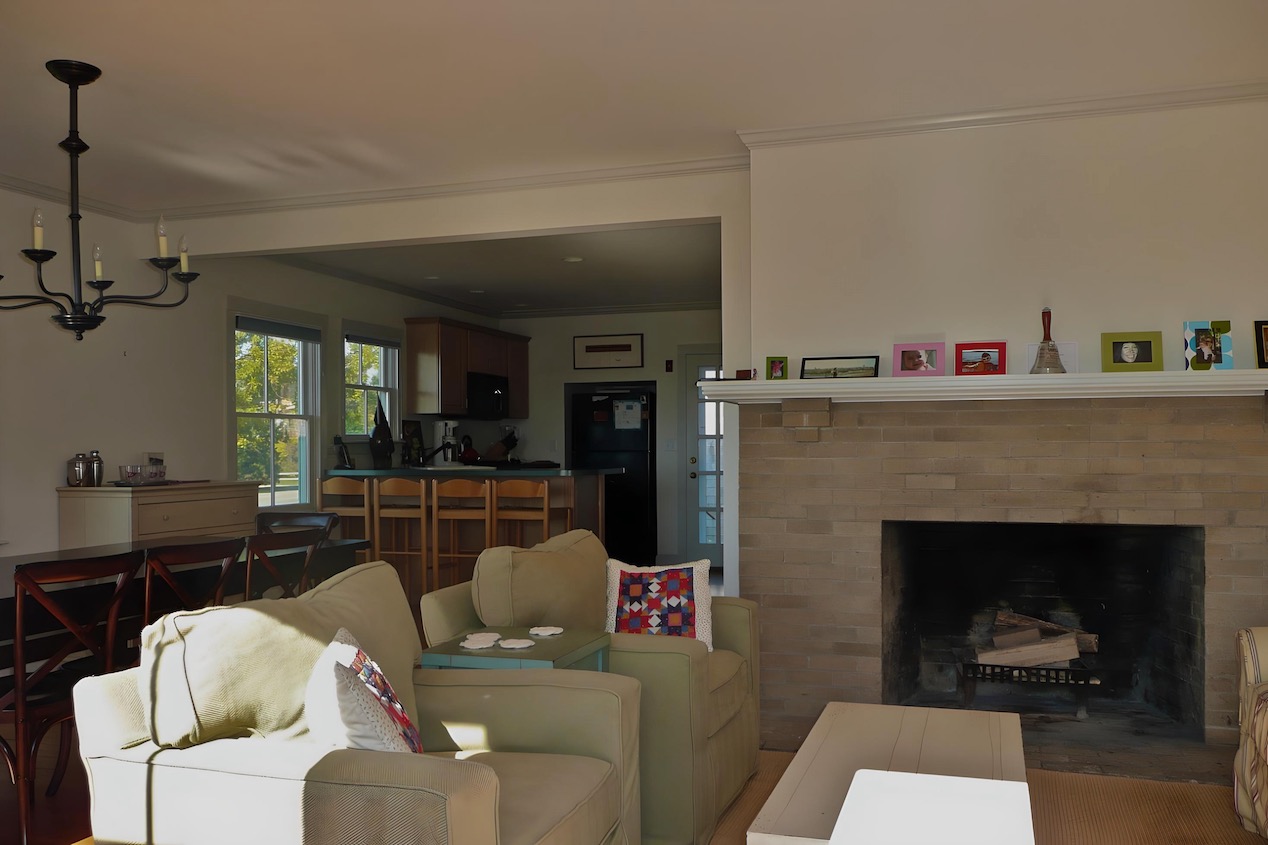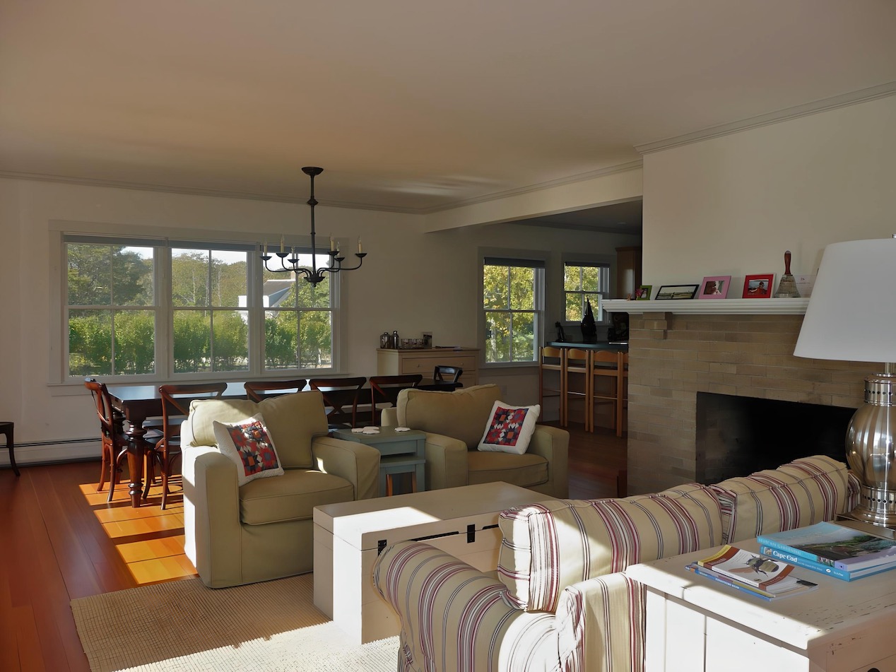 This house on a hill overlooking Stage Harbor had an unlikely origin as a pre-cut kit made in Ohio and shipped to Chatham, where it was assembled in the late 1930s. The interior walls and ceiling were finished with a relatively new material called plywood. Combined with very small windows, this made for a very dark interior. We brightened the house considerably by adding large windows to capture the water views, removing a wall between the kitchen and dining area, and by covering the walls and ceilings with drywall. Painted white, the living space is now filled with light, and the harbor is now a presence in the room.