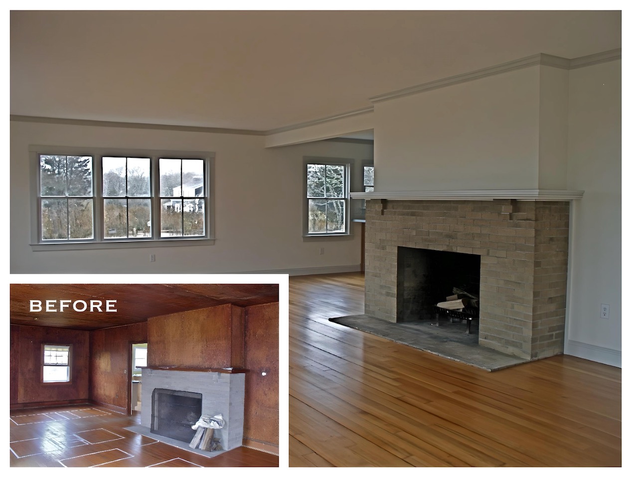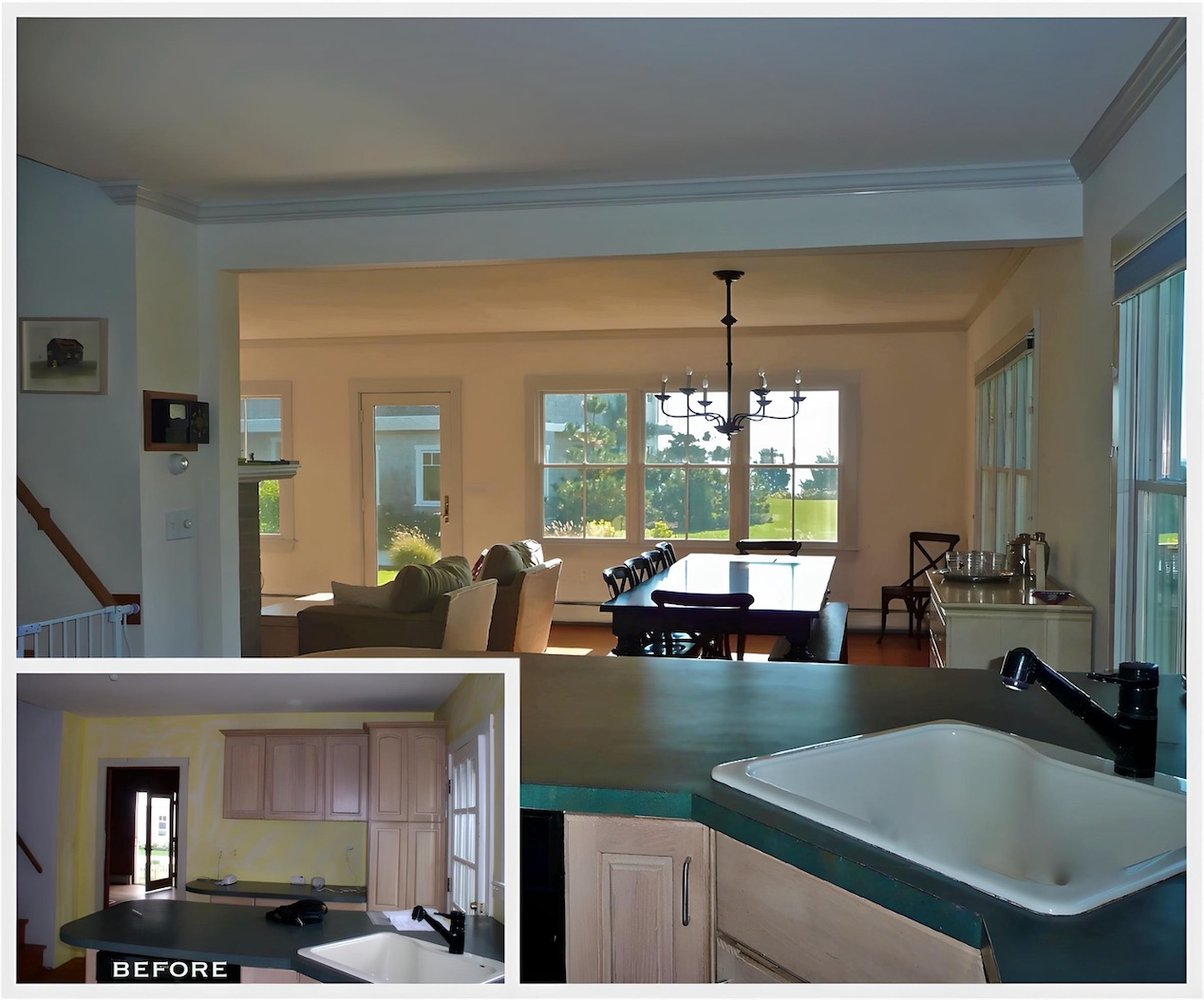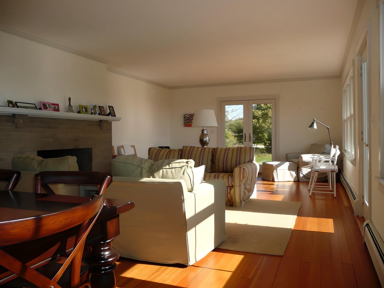 This house on a hill overlooking Stage Harbor had an unlikely origin as a pre-cut kit made in Ohio and shipped to Chatham, where it was assembled in the late 1930s. The interior walls and ceiling were finished with a relatively new material called plywood. Combined with very small windows, this made for a very dark interior. We brightened the house considerably by adding large windows to capture the water views, removing a wall between the kitchen and dining area, and by covering the walls and ceilings with drywall. Painted white, the living space is now filled with light, and the harbor is now a presence in the room.